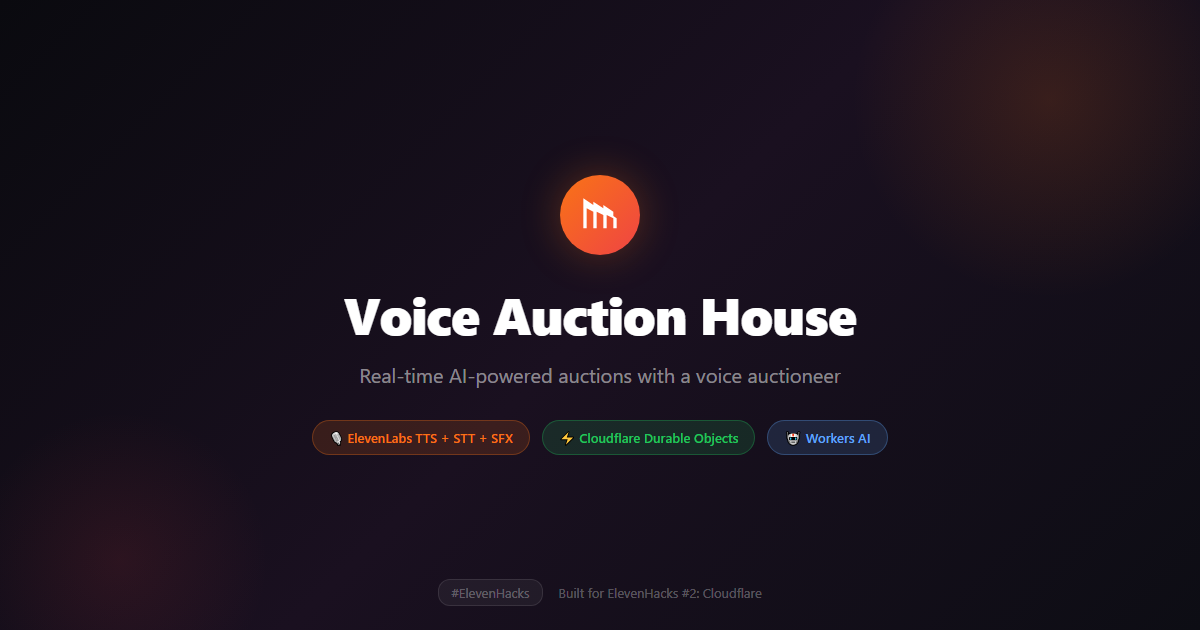 Real-time multiplayer auction platform with an AI auctioneer that speaks. Users join rooms, create auctions, and bid against each other. An AI auctioneer powered by ElevenLabs TTS reacts to every bid with natural voice, builds tension through "going once... going twice...", and celebrates with a gavel slam and crowd cheer via the Sound Effects API. Users can bid by speaking — Realtime STT transcribes speech, Workers AI parses the dollar amount. Each room is a Cloudflare Durable Object managing bid state, timers, and WebSocket connections. Uses three ElevenLabs APIs (TTS, Realtime STT, Sound Effects) and three Cloudflare features (Durable Objects, Workers AI, Workers).