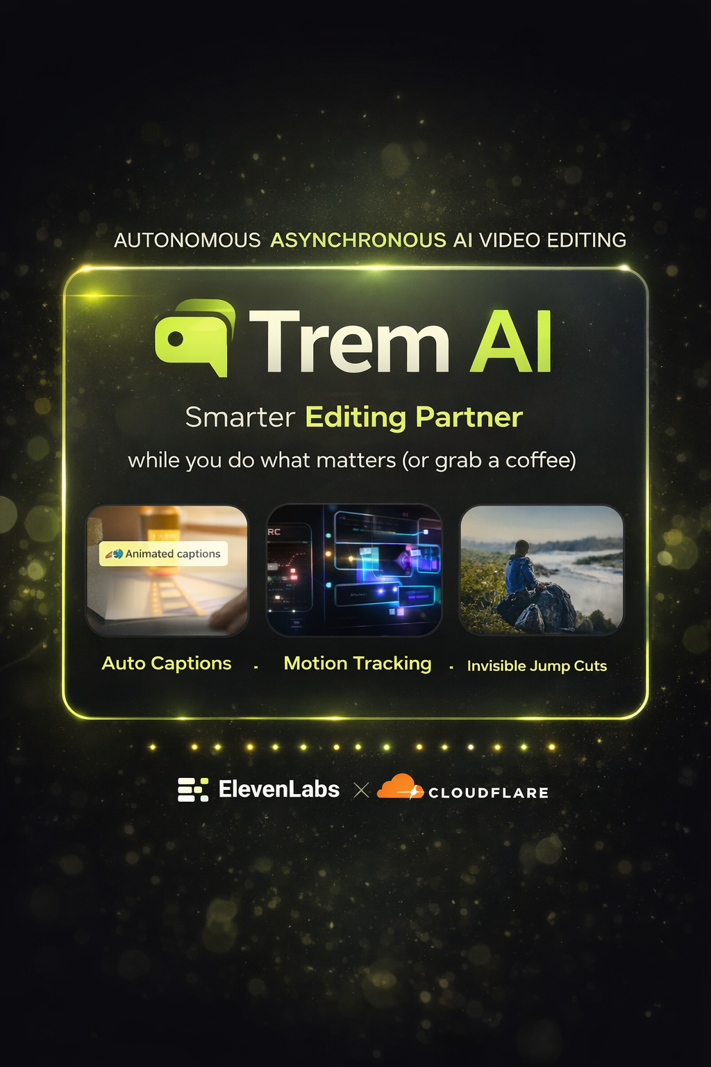 Trem is an autonomous, asynchronous AI video editing agent that turns raw footage into creator-ready edits like Auto Captions, Motion Tracking, Invisible Jump Cuts or full podcast edit. Built with Cloudflare and ElevenLabs, Trem lets users choose an editing technique, then handles the heavy lifting in the background, analyzing footage, with voice-guided creative direction, and assembling structured, story-driven results faster. Instead of manually piecing clips together, creators interact with Trem like a smart editing partner that understands both the footage and the final format.