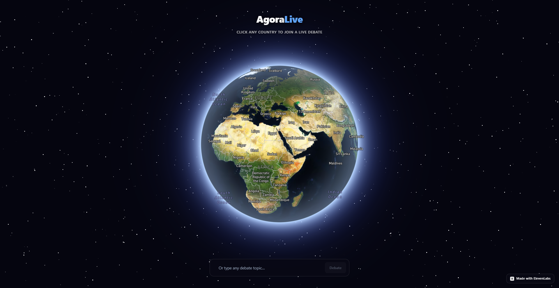 Agora Live is a real-time AI debate platform where you click any country on a globe and two AI characters from that country start arguing about a real current news topic, in their own voice, accent, and slang. It makes current affairs actually engaging by turning live headlines into an entertaining argument between two opinionated characters who genuinely disagree, with a mic button so you can jump in and make your own case. ElevenLabs powers the whole voice layer: Conversational AI handles the Scholar agent as a live real-time voice session that listens and responds when you interrupt, while streaming TTS synthesises the Maverick agent sentence by sentence for near-zero gap between turns, with a distinct ElevenLabs voice matched to each character's persona. Every debate room runs on a Cloudflare Durable Object, a persistent stateful server on the edge that manages room state, enforces turn limits, proxies API calls so keys never reach the client, and sets cleanup alarms if a browser drops, with Cloudflare Workers handling the API, KV caching live news topics per country, and a Cron Trigger refreshing them every 48 hours.