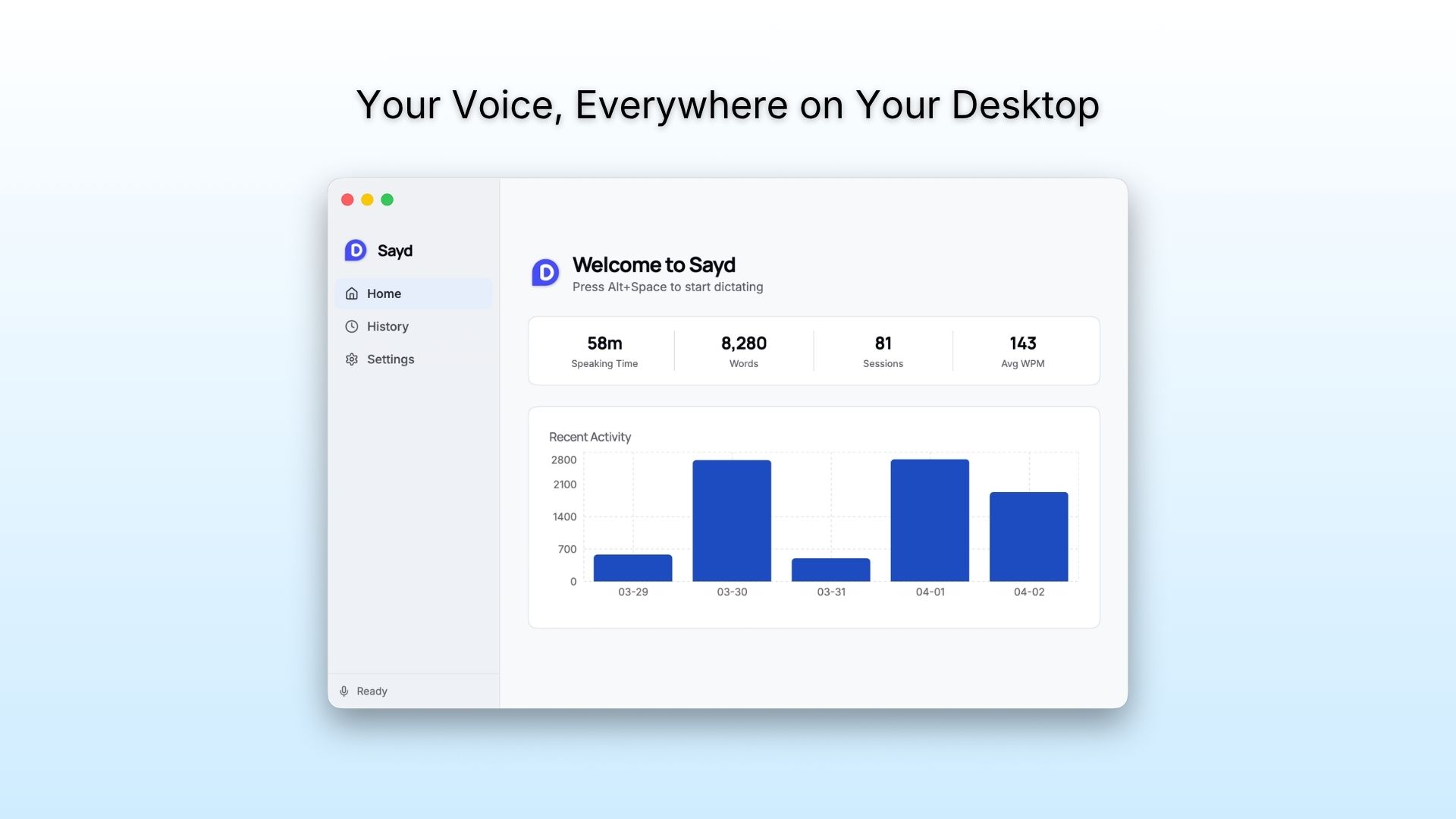 Sayd: Your Voice, Everywhere on Your Desktop What We Built Sayd is a macOS desktop app that lets you dictate into any application — email, Slack, code editors, browsers — with a single hotkey. Press the key, speak naturally, release, and polished text appears right where your cursor is. No copy-paste. No switching windows. It just works, everywhere. How We Used ElevenLabs + Cloudflare The entire backend runs on Cloudflare Workers with Durable Objects as a WebSocket server. Each voice session is handled by its own Durable Object instance. Thanks to Cloudflare's global edge network, the backend is always close to the user — no matter where they are — making the round trip insanely fast. Inside each Durable Object, we run TEN VAD (Voice Activity Detection) compiled to WASM to detect and trim silence from the audio in real-time, right at the edge. This means only the meaningful speech segments are sent downstream for transcription, reducing audio length by 30-50% and directly cutting recognition latency. The trimmed audio is then transcribed by ElevenLabs Scribe V2, which powers all of Sayd's speech recognition. Scribe V2's built-in multilingual detection automatically identifies the language being spoken — English, Mandarin, Traditional Chinese, Japanese, or Korean — so users can switch languages mid-conversation without changing any settings. An LLM then polishes the transcript — removing filler words, fixing punctuation, and formatting the text naturally — before the final version is injected right at the user's cursor in whatever app they're using. What Makes It Special Fast by architecture. Edge-based VAD trimming, Cloudflare's global network, and ElevenLabs Scribe V2 combine into a pipeline where every stage is optimized to minimize latency. Users feel the result: speak, and polished text appears in under two seconds. Truly universal text input. Sayd injects text directly where your cursor is — in any macOS app — via the system Accessibility API. It doesn't matter what app you're in; if there's a cursor, Sayd can type there. Global hotkey that works everywhere. Sayd registers a system-level hotkey that works across all apps and contexts. Hold the Fn key (or any custom key combo you set), speak, and release. The interaction is always one key press away, no matter what you're doing. Multilingual out of the box. Powered by ElevenLabs Scribe V2's language detection, Sayd supports five languages with zero configuration. Speak in any supported language and it's recognized and polished correctly — including mixed-language dictation. Resilient. Every recording is saved locally. If anything goes wrong, you can retry transcription with one click.