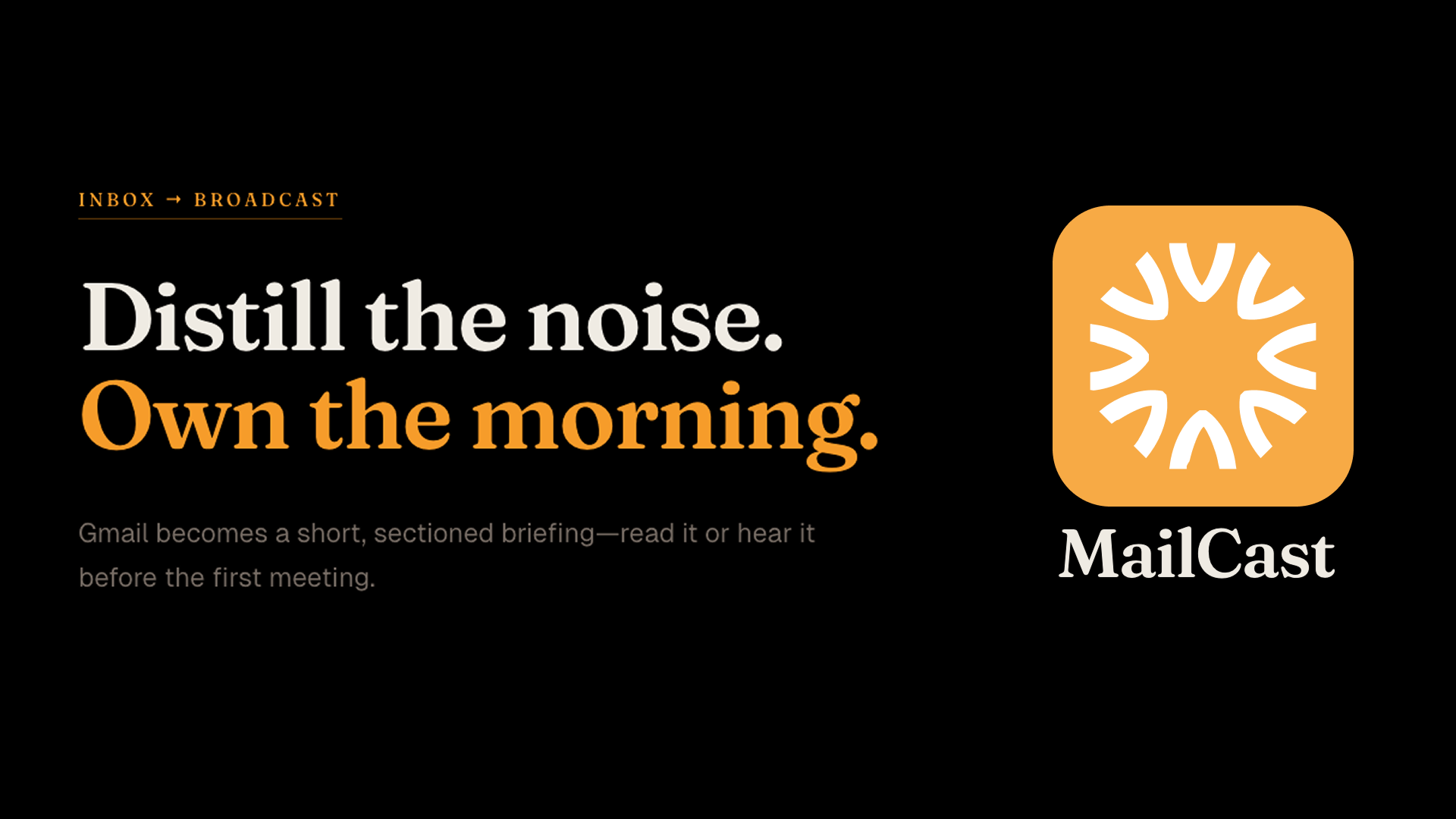 - What it is: Connect Gmail → AI summarizes and classifies unread primary mail → groups it into sections → writes a short spoken script → ElevenLabs turns it into MP3 → you get a briefing (target ~60s), not a full email read-aloud. - Problems it targets: Too much inbox noise, fuzzy priorities, and tools that stay text-only instead of a quick audio digest. - Cloudflare: + Workers + Hono API. + React SPA via Static Assets. + Workers AI (Llama) for summary/classify/script. + D1 for data. + KV for sessions + R2 for stored audio. - ElevenLabs: ElevenLabs turns it into mp3