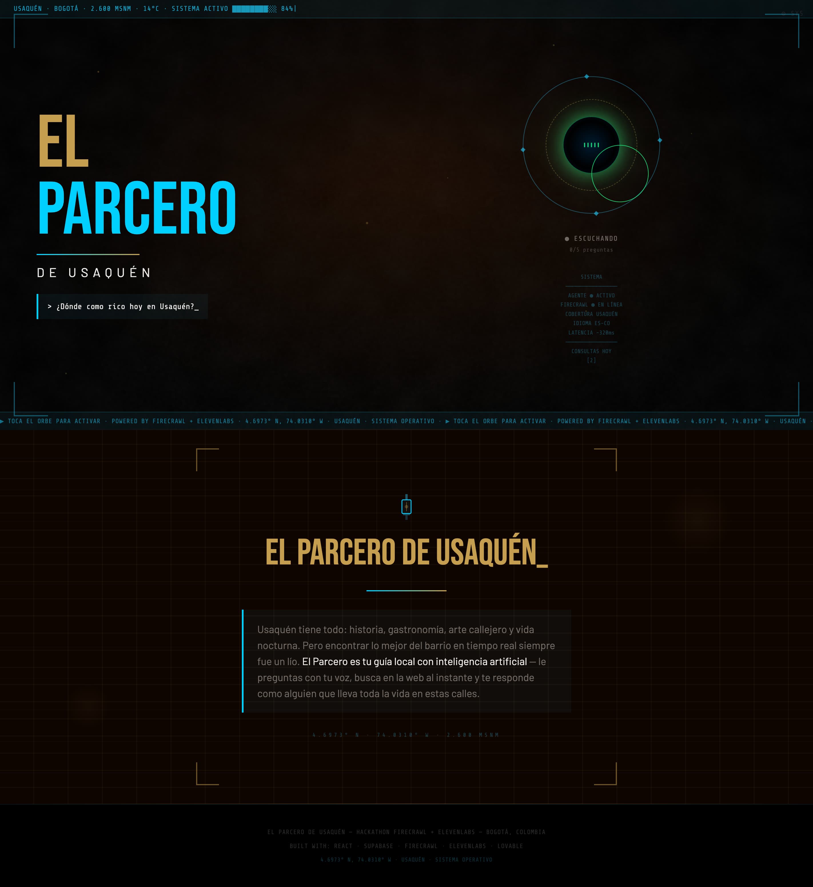 We built El Parcero de Usaquén — a real-time voice agent that acts as the ultimate local guide for Usaquén, one of the most visited neighborhoods in Bogotá, Colombia. The problem we solved is simple: everyone googles "what to do in Usaquén" and gets the same flat, outdated, ad-driven list. No context. No real-time data. No personality. El Parcero fixes that. Users speak naturally in any language. The agent uses Firecrawl Search to crawl the web in real time — pulling live reviews, business info, events, and schedules across the neighborhood. ElevenAgents then processes that data and responds with a voice that has actual personality: warm, knowledgeable, opinionated, and built around the culture of the neighborhood. Under the hood: when a user asks a question, ElevenAgents triggers a webhook to a Supabase Edge Function, which calls the Firecrawl Search API with a location-aware query. The results come back as clean markdown, get synthesized, and are delivered as a natural voice response in under two seconds. What makes it different from a chatbot or a search engine is the combination of live web intelligence via Firecrawl and expressive voice via ElevenAgents. Every answer is grounded in real, current data — not a knowledge base frozen in time. And it works in any language, instantly. We also built a full admin panel where the neighborhood, search parameters, agent personality, and voice can all be reconfigured — making this replicable for any neighborhood, city, or destination in the world. Stack: Firecrawl Search · ElevenAgents · Supabase Edge Functions · React · Lovable