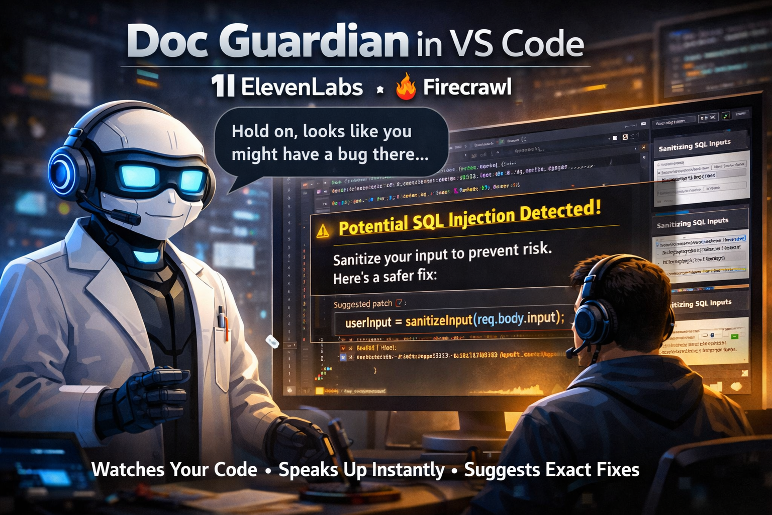 Doc Guardian is a voice-first coding copilot inside VS Code that eliminates the “leave IDE, search docs, come back” loop. You can ask questions in voice or text while coding, and it answers with practical, patch-style guidance using your actual repo context: active file, selected code, diagnostics, nearby code, and referenced files. It also remembers project context and sessions, so conversations stay grounded instead of resetting every time. Under the hood, it combines ElevenLabs ElevenAgents and Firecrawl Search in real time. ElevenAgents handles the conversational brain + voice experience and calls client tools to fetch live coding context and monitor findings. Firecrawl powers documentation retrieval from the web so answers are based on current sources, not stale model memory. The result is a repo-aware assistant that can explain, debug, compare APIs, and suggest exact fixes without breaking your coding flow. The viral demo moment is simple: you’re coding, a risky pattern appears, and Doc Guardian interrupts with a relevant warning, source-backed docs, and a minimal fix path before the bug ships. It feels less like “chatting with an AI” and more like having a technical cofounder in your editor that watches your code, knows your stack, and speaks back instantly.