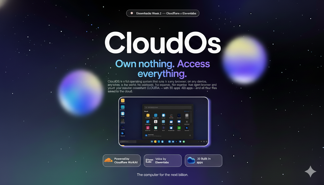 CloudOS is a full cloud operating system that runs entirely in a browser — giving the 3 billion people who cannot afford a computer access to a real Windows-style desktop with 30 built-in apps, cloud file storage, and persistent accounts across any device. Every CloudOS user has CLOUDIA, a personal AI voice assistant powered by ElevenLabs that responds naturally to voice commands like "CLOUDIA open Notepad" or "CLOUDIA help me write this email" — making technology feel human for the first time for millions of users worldwide. The entire intelligence of CloudOS runs on Cloudflare Workers AI using Llama 3 for conversation and DeepSeek Coder for programming help, deployed across Cloudflare's 300+ global edge locations so that a user in Lagos gets the same instant experience as a user in London.