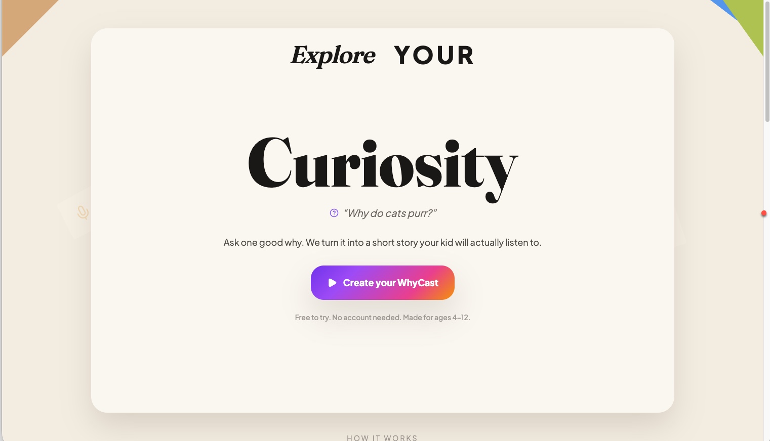WhyCast creates personalized stories to answer kids' why questions in seconds. Turn kids' unending questions and curiosity into a learning adventure, made for them. Built using Cloudflare Workers, Durable Objects, and Workflows, ElevenLabs, and some special sauce for a seamless, realistic audio experience.