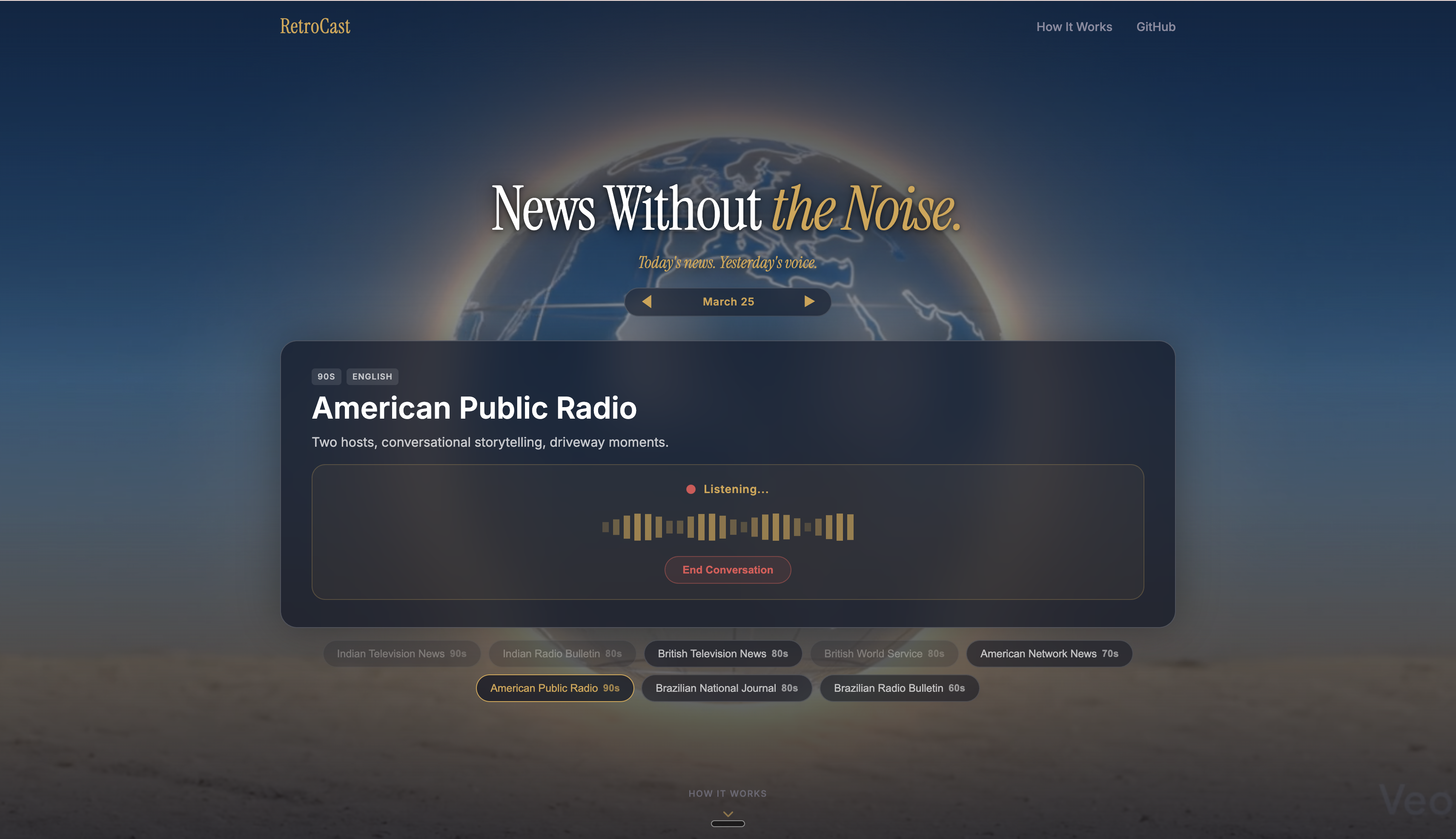 RetroCast takes today's headlines and rebroadcasts them in 8 vintage styles from 4 countries. 1970s American network TV, 1960s Brazilian radio, 1980s BBC, 1990s Indian Doordarshan, and more. Firecrawl powers the entire news pipeline: searching headlines across 6 categories, filtering by country, and cross-checking every story against fact-checking sources before a word is spoken. During live calls, 4 Firecrawl webhook tools (search, fact-check, scrape, extract) let the anchor research and verify claims in real time. ElevenLabs generates every broadcast. Text-to-Dialogue gives TV formats two anchors trading stories, while radio formats get a solo narrator. 16 unique voices across 3 languages. ElevenAgents powers a live dial-in where you can call the anchor, ask questions, and get answers backed by real-time Firecrawl lookups.